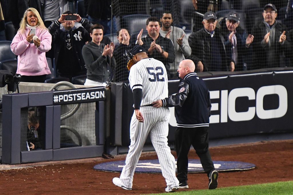 As C.C. looked to stop the bleeding and close the door on the eighth inning, in stepped George Springer. Yankee’s Stadium echoed with “C.C.” chants as Sabathia worked the count to one and one. Delivering the third pitch of the at-bat C.C. threw a cutter to Springer that reached 89 MPH on the inside half for ball two. Sabathia then gave an awkward motion after the pitch and went behind the mound to gather himself. Yankee’s trainer, Steve Donohue was the first one out there to check on his pitcher he’s treated since 2009. Followed by Yankee’s manager, Aaron Boone, who watched with Donohue as C.C. threw a warm up pitch to see if he was able to finish out the inning.